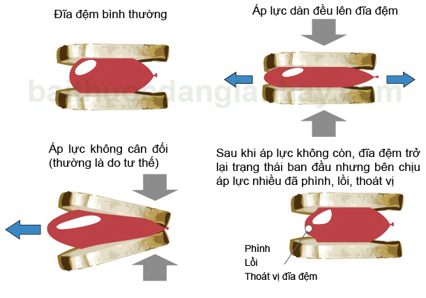 Đĩa đệm là những cấu trúc thớ sợi chắc chắn xếp theo hình vòng tâm và có chứa nhân nhầy ở bên trong, nằm giữa khoang của các đốt sống. Các đĩa đệm có chức năng nâng đỡ cột sống, giúp cơ thể thực hiện các động tác linh hoạt và bảo vệ cột sống trước những rung xóc.