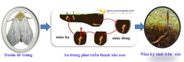 Các sợi nấm bắt đầu phát triển mạnh nhờ hút các chất dinh dưỡng từ cơ thể con sâu non và lớn dần lên. Dần dần, do chất dinh dưỡng bị nấm “ăn hết”, chỉ còn lại lớp vỏ bì bên ngoài nên sâu không thể lột xác để thành bướm được nữa. Mùa xuân đến, khi thời tiết và nhiệt độ thích hợp, nấm sợi mọc dài ra từ râu xúc giác của con sâu, cắm sâu vào mặt đất. Đoạn đầu của nấm phình to ra, hình dạng giống như một cái que, trên bề mặt có rất nhiều bào tử hình cầu nhỏ xíu, phát tán trong không khí… lại đi tìm sâu bướm dơi để ký sinh bắt đầu cuộc đời mới. Người xưa cho rằng loài sâu mùa đông ấy, đã biến thành ngọn cỏ mùa hạ này nên gọi là “đông trùng hạ thảo”. Đây là một loại dược phẩm rất quý của Đông y, nên người ta đua nhau đi thu nhặt, phơi khô để bán.